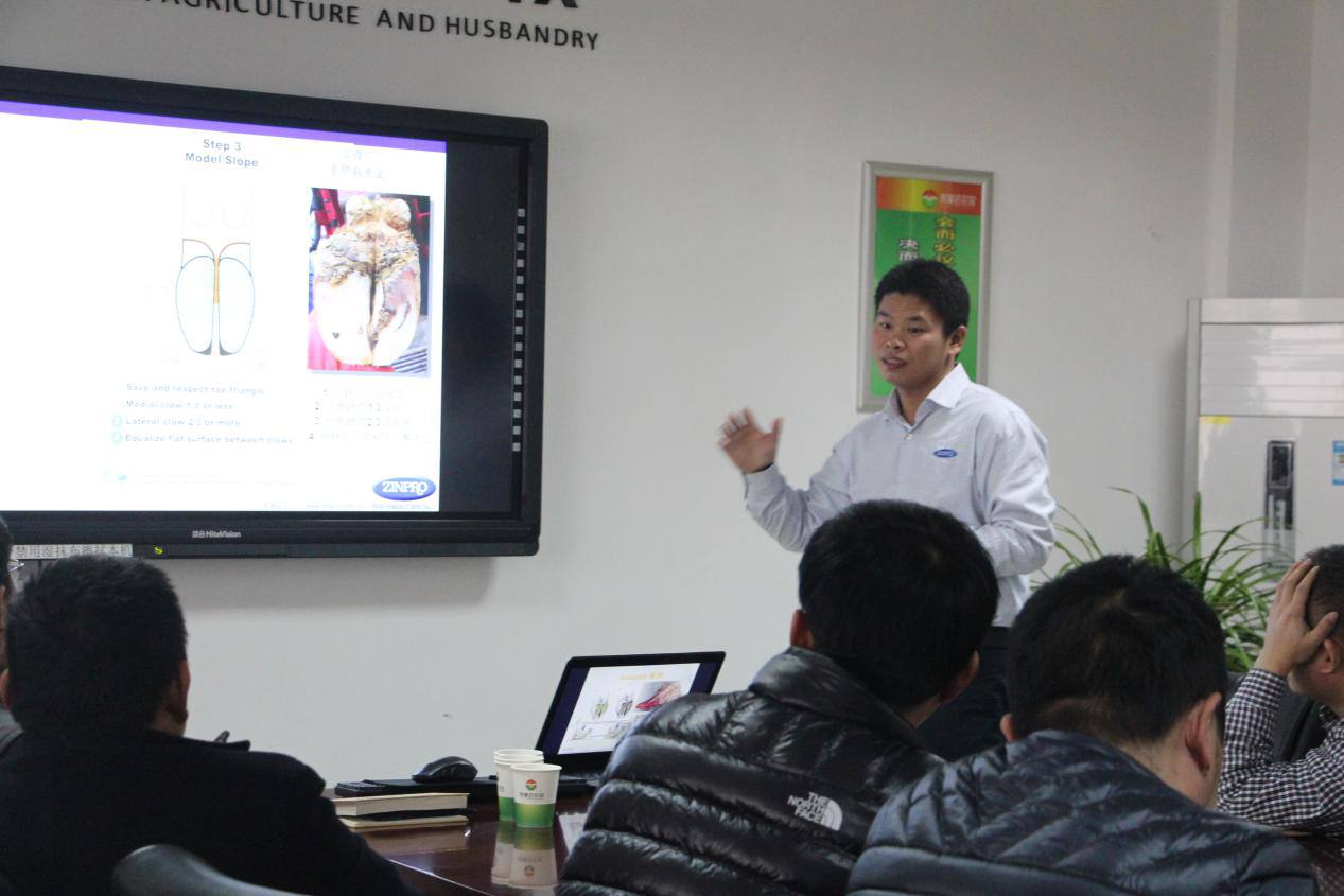 ? ? 12月22日,美國金寶公司徐國忠博士一行到我公司進行技術交流。徐博士用兩個多小時的時間給我公司銷售和服務人員做了一場關于奶牛蹄病防治的精彩報告,并同我公司技術服務人員做了互動,會場氣氛十分活躍,討論十分熱烈,與會者都有頗多收獲。圖片為會議現場。